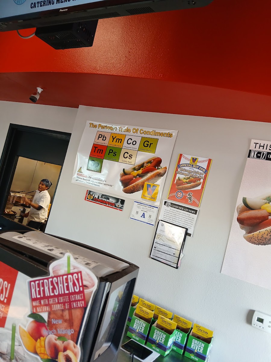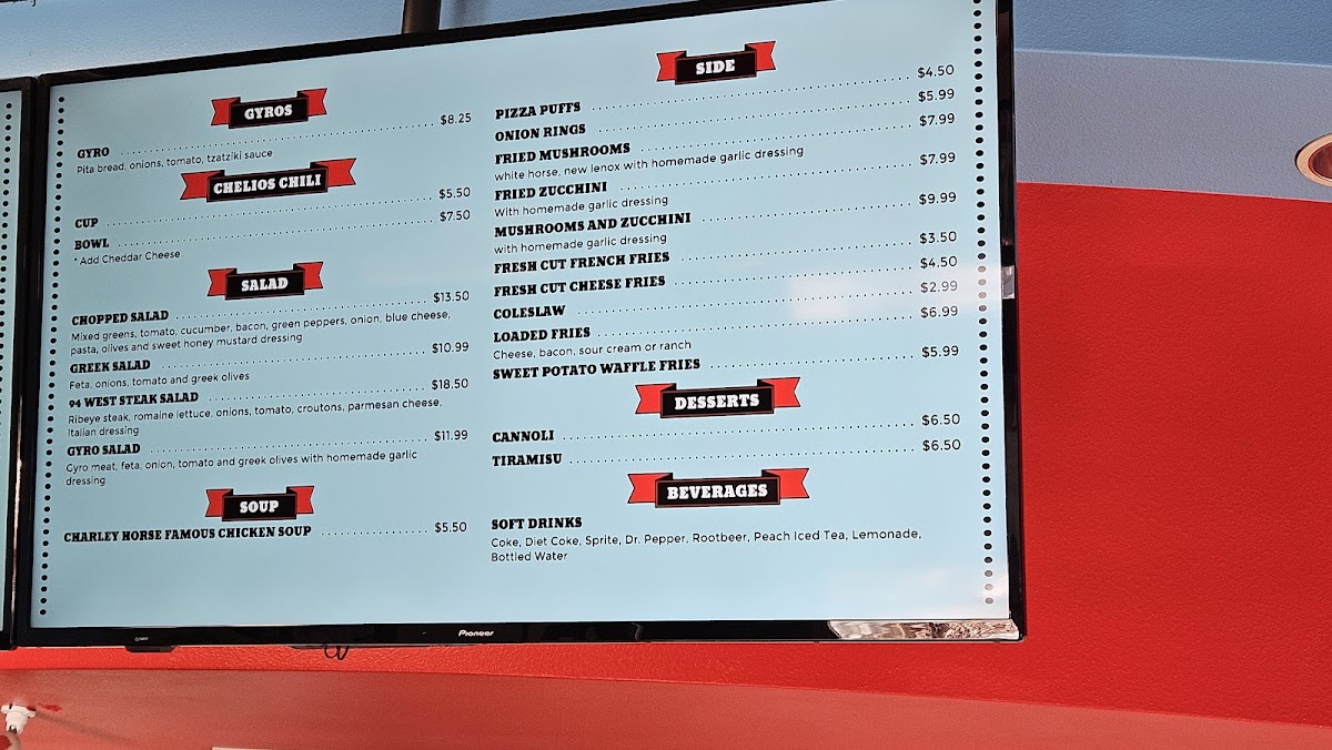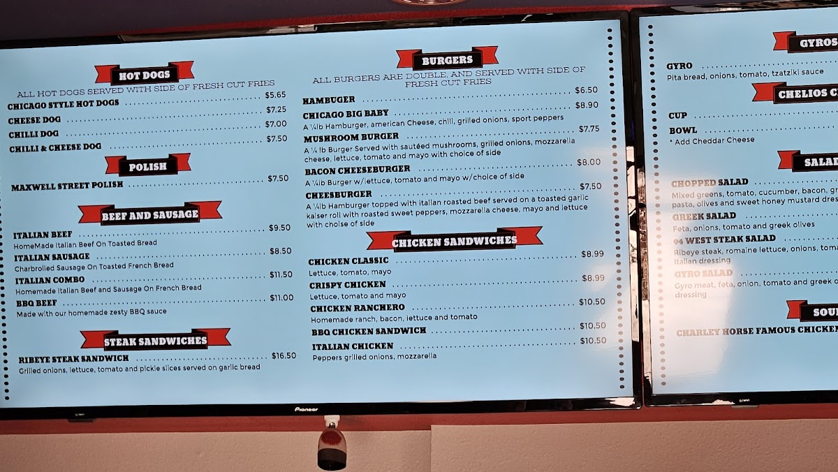 The menu features a range of hearty sandwiches like the Italian Chicken and Chicago Style Hot Dog, alongside shareable sides such as fresh cut cheese fries and sweet potato fries. These items pair well with simple, refreshing drinks like Green River or classic canned beverages, making it easy to enjoy a laid-back dining experience without fuss.